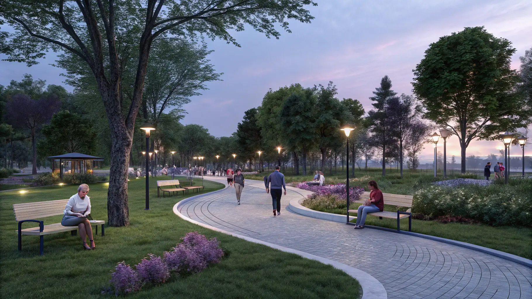 Un parc urbain qui allie harmonieusement espaces verts et infrastructures contemporaines, favorisant l’engagement communautaire et la durabilité environnementale.